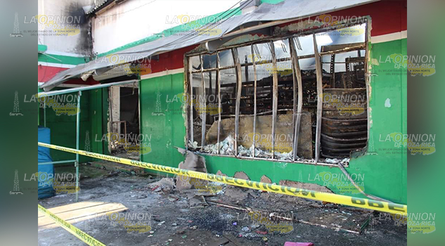 Cerro Azul, Ver.- Las labores en el área donde se registró el incendio de la tienda de su bodega en la zona centro de Cerro Azul continuaron por las corporaciones de emergencia durante la mañana de este jueves, luego de que el fuego en el interior de la tienda comenzara de nueva cuenta entre los escombros.