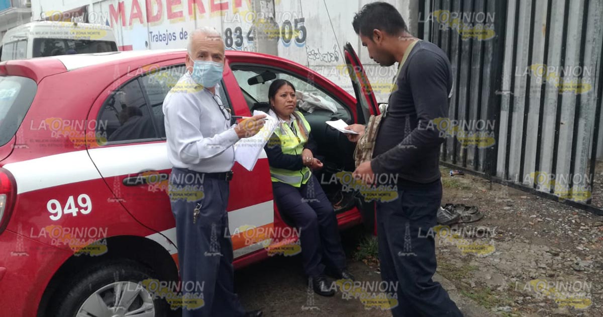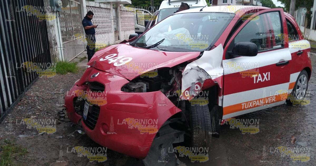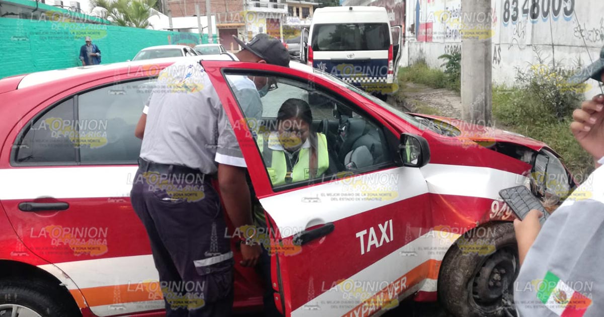 Tuxpan, Ver.- Trabajador del volante y su esposa resultaron lesionados al chocar el taxi en el que viajaban en un poste de CFE; paramédicos atendieron a las víctimas y las trasladaron a la clínica del IMSS para su atención médica mientras que personal de Tránsito Municipal remitió el vehículo al corralón.