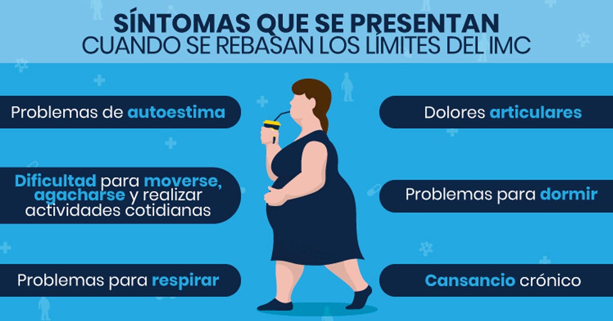 De acuerdo con la jefa de Área de Nutrición y Salud en Primer Nivel del IMSS, Julia del Carmen Rodríguez García, los síntomas que se presentan cuando los límites del IMC se han rebasado son: problemas de autoestima, dificultad para moverse, agacharse, realizar actividades cotidianas y respirar; dolores articulares, problemas para dormir y cansancio crónico.