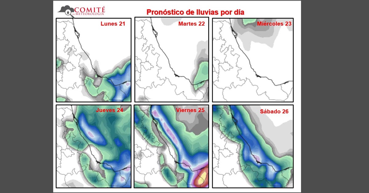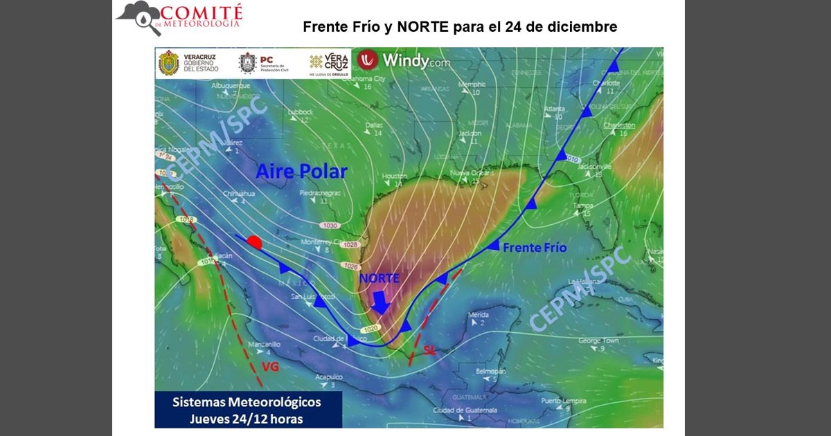 El pronóstico a mediano plazo muestra efectos de otro frente frío junto con su masa polar a partir del jueves 24 de diciembre con nuevo aumento del potencial de lluvias, marcado descenso de temperatura y un Norte violento con probables rachas máximas mayores a 100 km/h.
