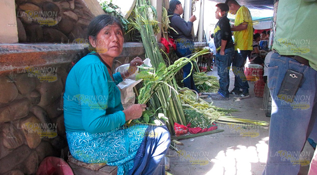 Al natural o pintadas de colores diversos, entre los que resaltan el rosa mexicano, el morado y el verde bandera, los ramos de palma se extienden por las banquetas de la calle Sor Juana Inés de la Cruz, frente al templo parroquial de Nuestra Señora de los Dolores, y en la entrada principal hacia el atrio, donde decenas de vendedores esperan con ansia ventas que les permitan obtener buenas ganancias económicas.