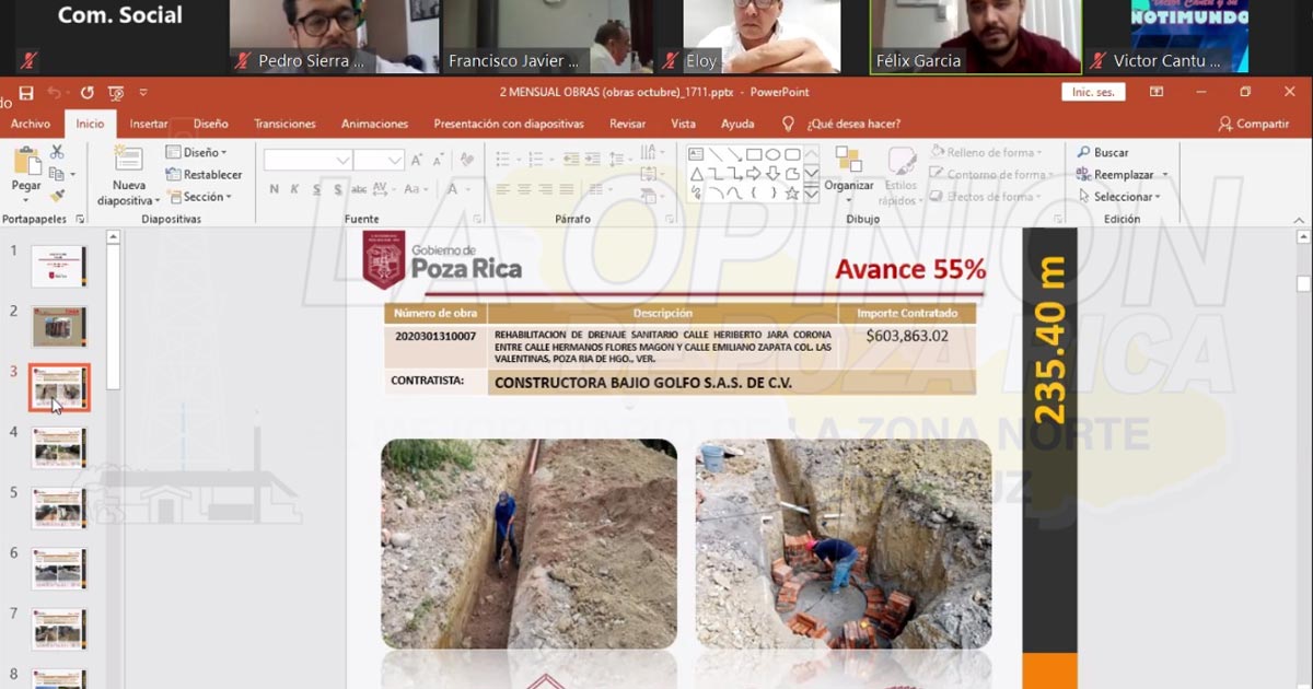 Durante la presentación del informe de Avances Físicos de Obras, se aclaró que están en ejecución obras que tiene que ver con la construcción de drenaje sanitario, construcción de pavimento hidráulico, guarniciones y banquetas, muros de contención y alumbrado público, bardas perimetrales para las escuelas, comedores escolares, módulos sanitarios, programa rehabilitación de pavimento asfáltico en diversas calles de la ciudad, y acciones de bacheo.