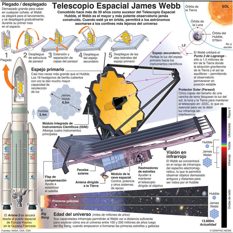 Presentado como el sucesor del telescopio Hubble, lanzado en 1990, el JWST debe explorar con una precisión inigualable todas las fases del cosmos, hasta las primeras edades del Universo y la formación de las primeras galaxias.