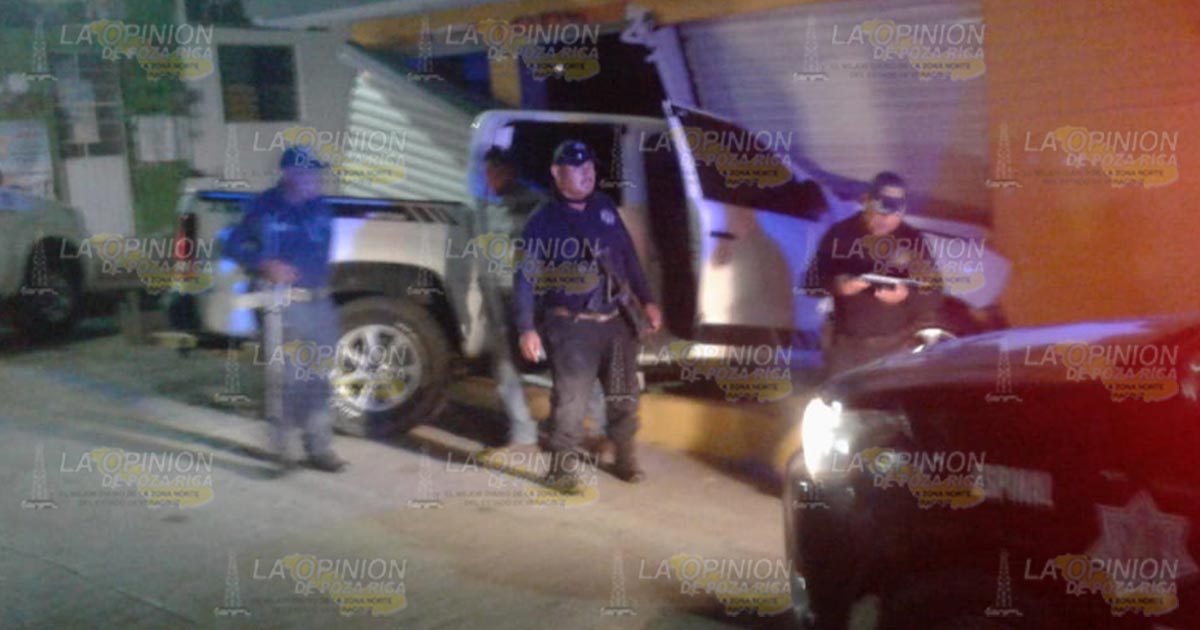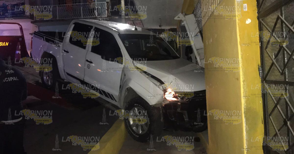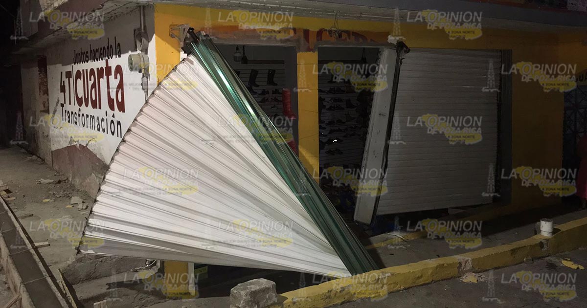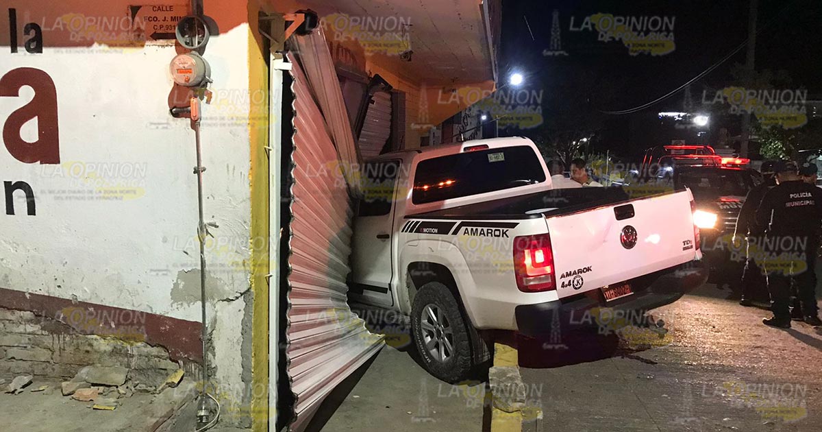 Espinal, Ver. – Camioneta destroza cortina de una zapatería luego de chocar contra ella; el chofer de la unidad perdió el control por manejar aparentemente en estado de ebriedad.
