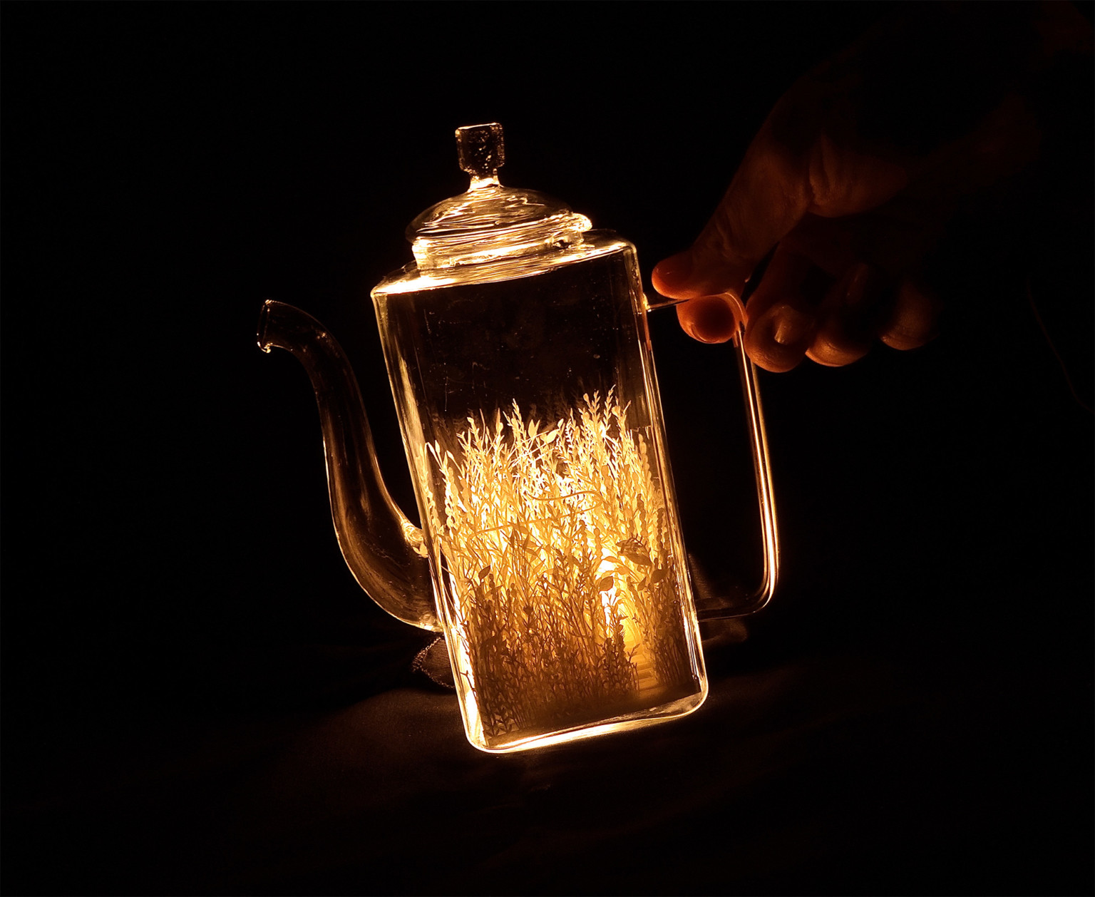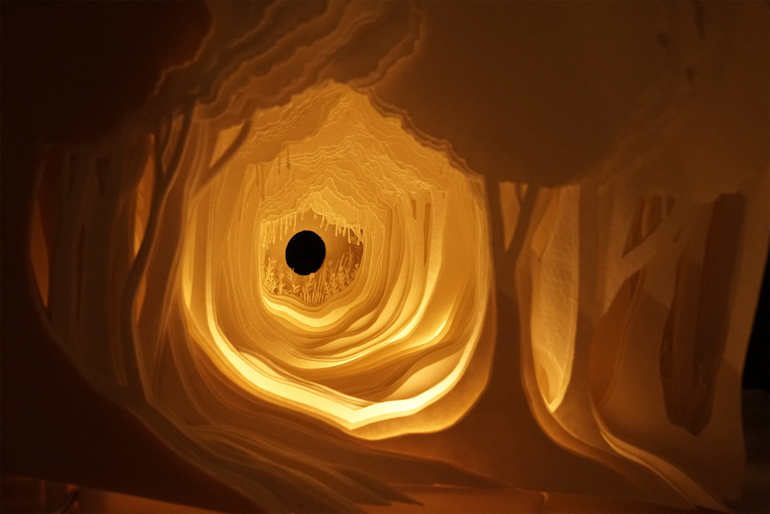 “El mundo del papel que se desarrolla dentro del vidrio expresa el micro mundo, que es nuestro mundo humano, la Tierra, el universo y otros universos y dimensiones. La instalación forestal expresa el macro mundo que está fuera de nuestro universo, los mundos desconocidos».
