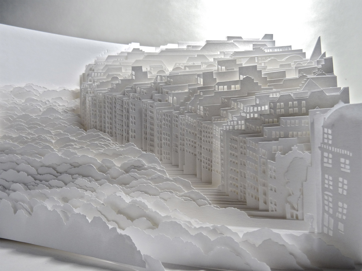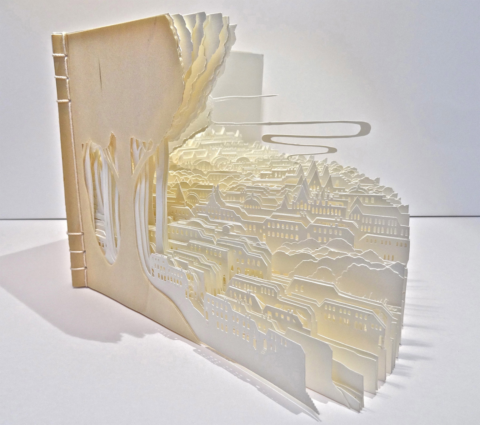 Así trabaja la artista japonesa Ayumi Shibata, se planta ante una montaña de hojas pulcras, y convierte su homogeneidad blanca y rectangular en intrincadas ciudades y bosques de cuento.