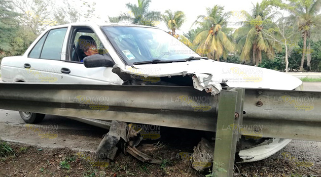 Tuxpan, Ver.- Una automóvil que fue impactado por una pipa, terminó estrellado en la barra de contención de la autopista Tuxpan – Poza Rica, así mismo una mujer que viajaba en el asiento del copiloto resultó con diversas lesiones pero no fue trasladada a algún nosocomio a pesar de que paramédicos de la empresa MEDEVAC arribaron a la emergencia.