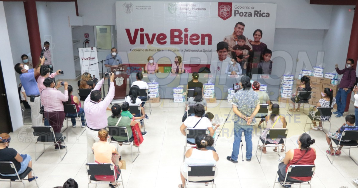 Poza Rica, Ver.- “No podemos permitir que nuestros hijos, por no tener una nutrición adecuada tengan problemas de salud”, aseguró el alcalde Francisco Javier Velázquez Vallejo, al encabezar la mañana de éste miércoles la Entrega de Leche en Polvo a madres en situación de vulnerabilidad con hijos lactantes de 1 a 3 años de edad”, que se llevó a cabo, en apego a las condiciones de prevención a la salud, en el auditorio municipal Rafael Hernández Ochoa, y con lo cual se da inició a la entrega de beneficios sociales del gobierno de Poza Rica, en el marco del Programa de Bienestar Social Vive Bien 2021”.