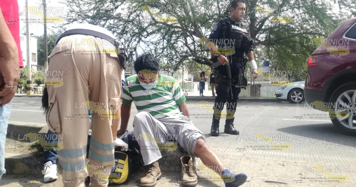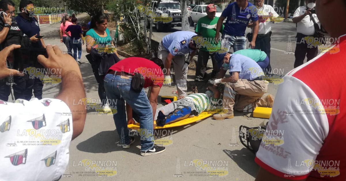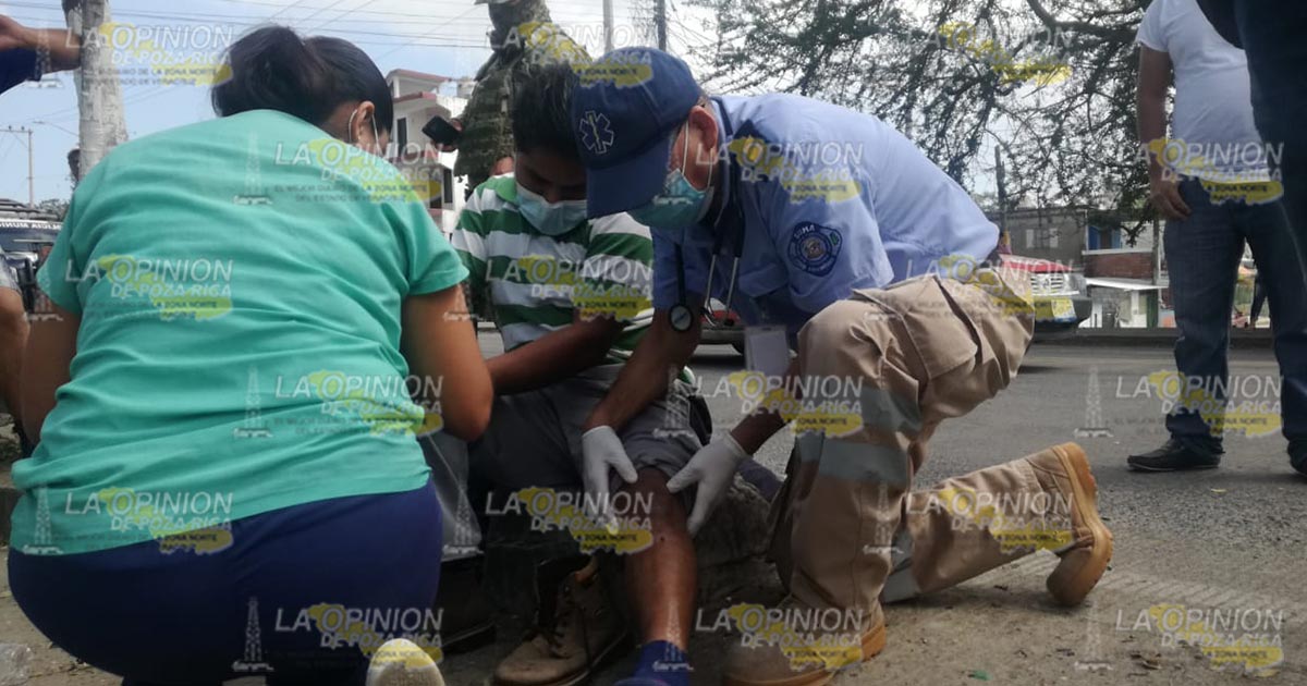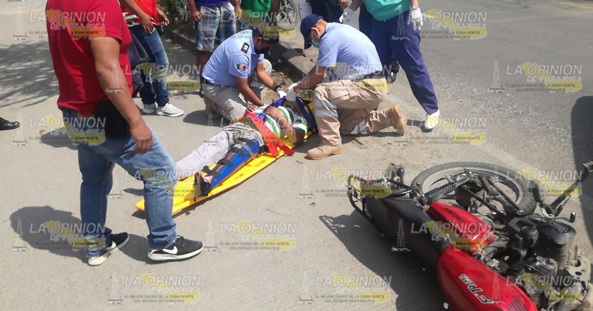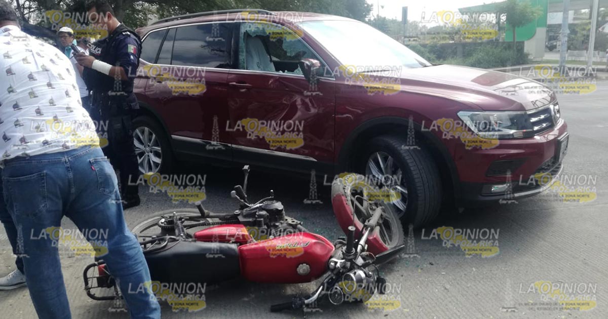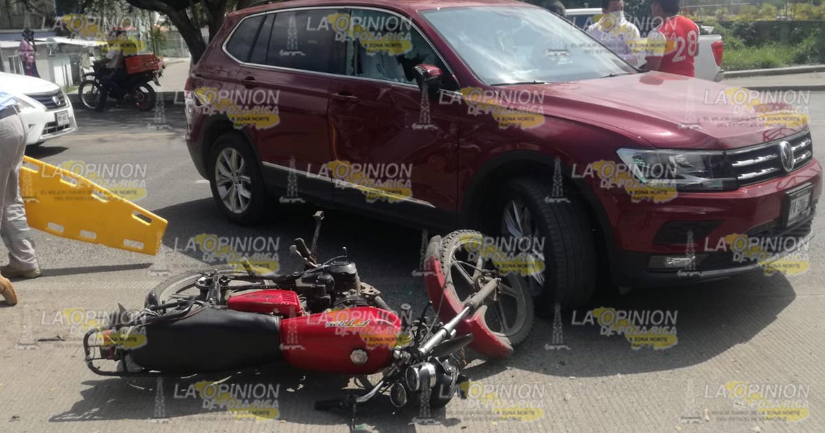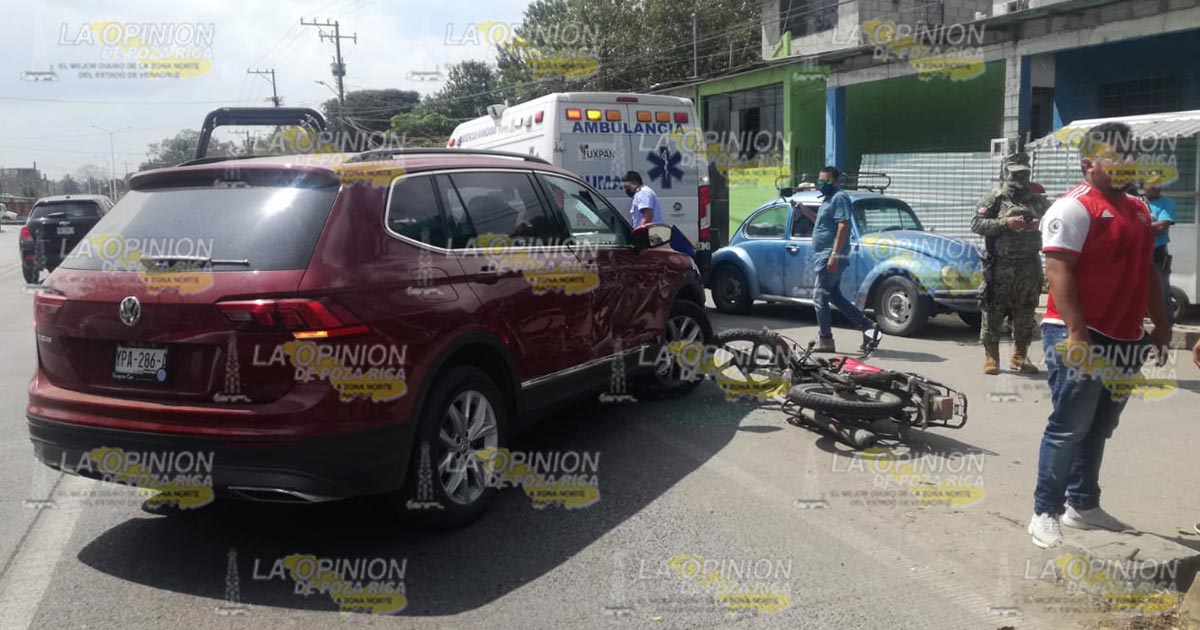Tuxpan, Ver.- El choque de una camioneta con un motocicleta dejó como saldo cuantiosos daños materiales y una persona lesionada; personal médico del grupo suma atendió a la víctima y lo trasladó al Hospital Civil.