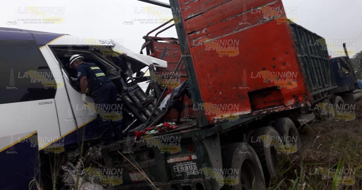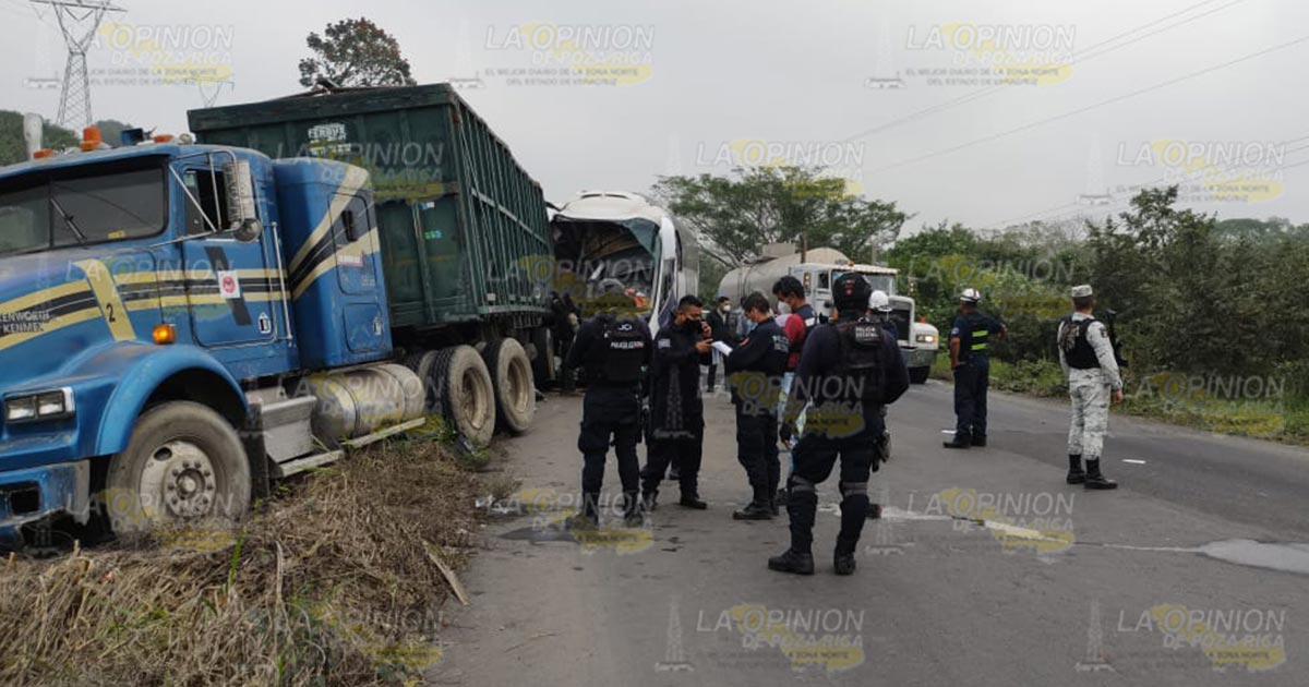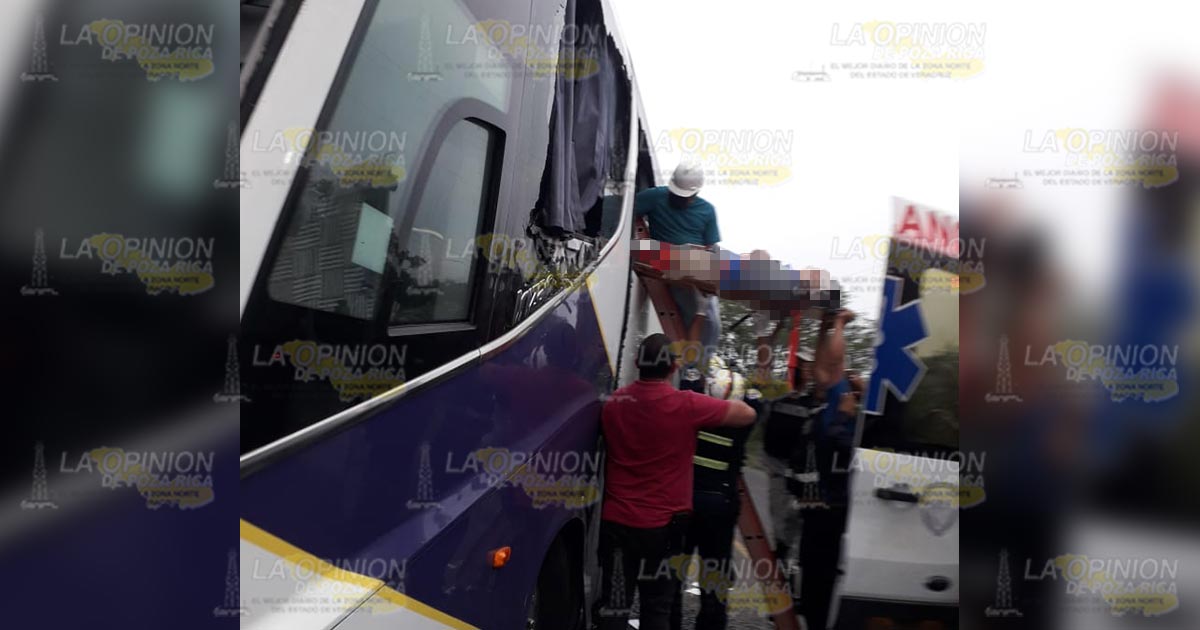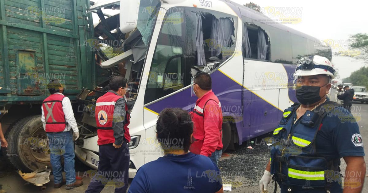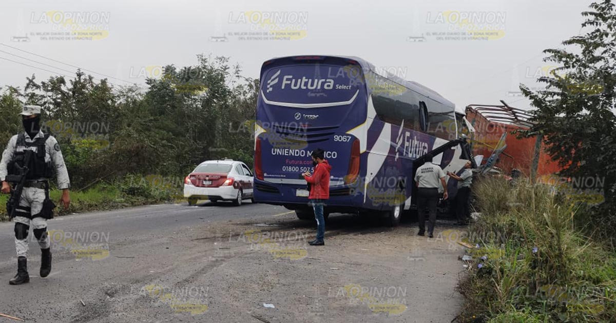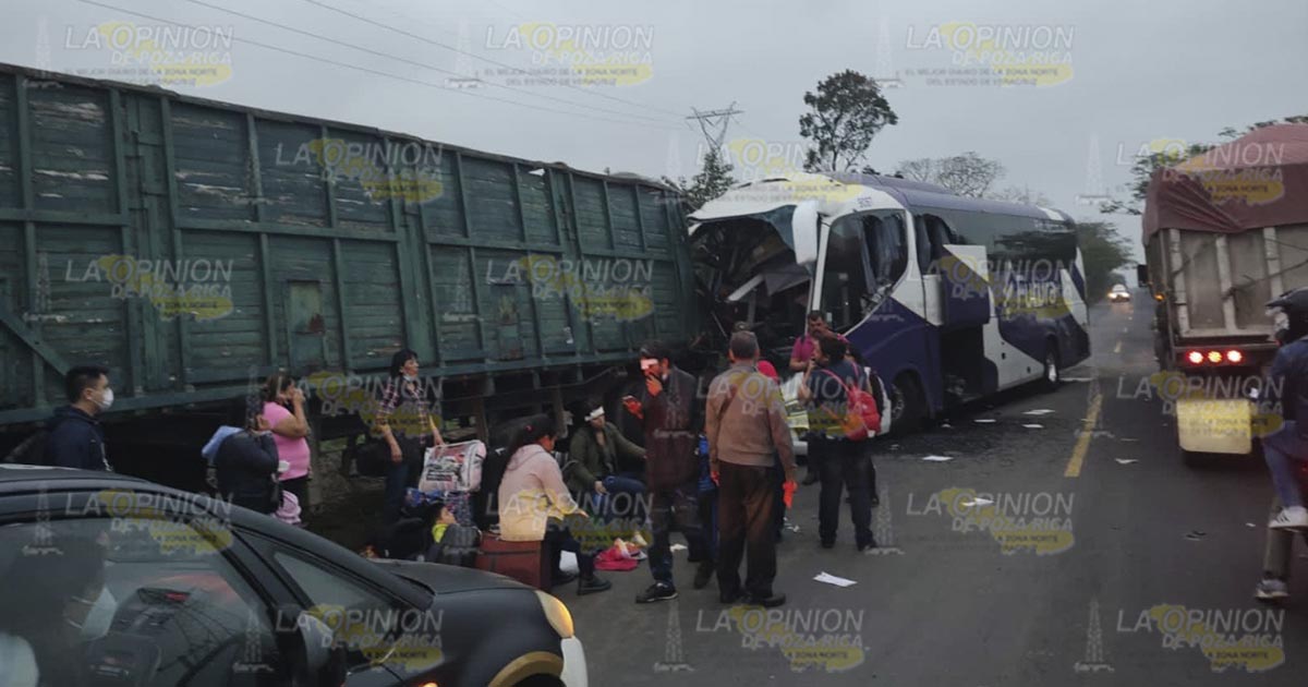 Álamo, Ver.- Doce personas lesionadas, al menos una de ellas prensada, y daños materiales cuantiosos fue el saldo de un brutal encontronazo entre un autobús de pasajeros y un tráiler que se encontraba estacionado en el acotamiento de la carretera federal 127 Alazán-Martínez de la Torre, a la altura de la localidad Horcones, la mañana de este jueves.