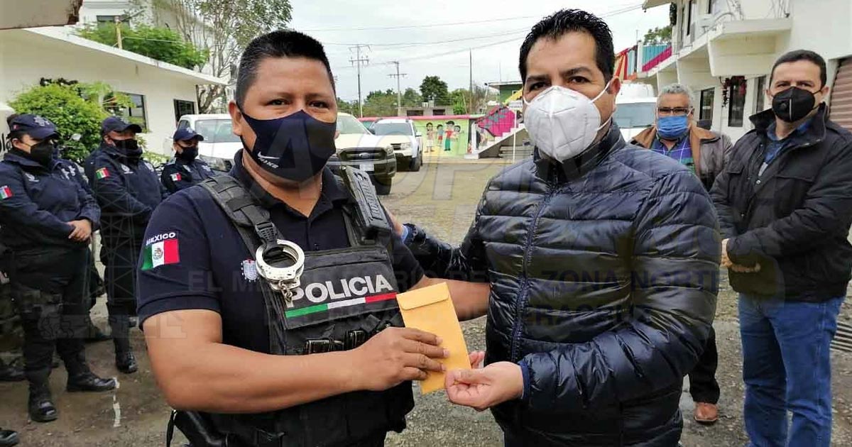 El mandatario municipal en compañía de su esposa Blanca Esther Pérez Vicencio, Presidenta del DIF Municipal, ofrecieron un apoyo económico individual a los elementos, que les fue entregado de manera directa en sus manos y sin intermediarios.