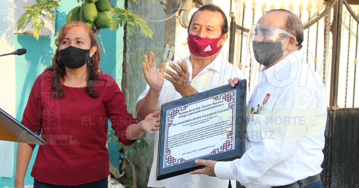 Poza Rica, Ver.- Vecinos de la colonia Vicente Herrera entregaron un reconocimiento expresando al alcalde Francisco Javier Velázquez Vallejo, que se ha destacado realmente por cambiar a Poza Rica, con la realización de obras y acciones que dan muestra de su profundo sentido de servicio y que la administración municipal que encabeza, construye y lo hace muy bien, para lograr una mejor sociedad pozarricense.