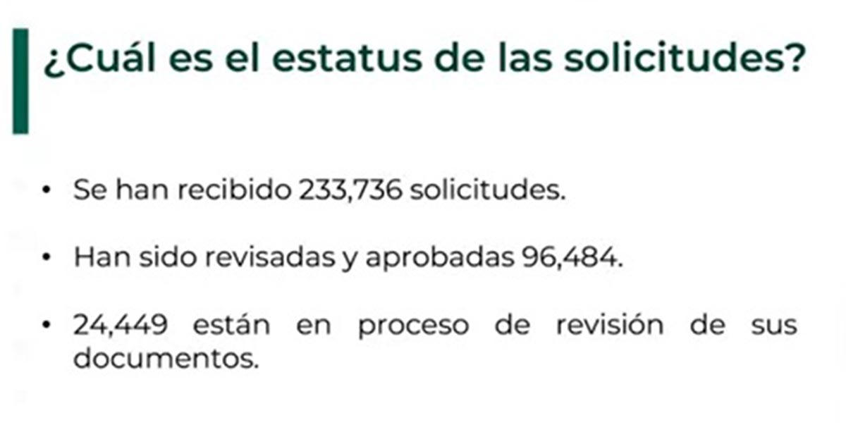 “Al 8 de abril se han recibido 233 mil 736 solicitudes, todas estas solicitudes sin ser revisadas. Y han sido aprobadas 96 mil 484. Otras 24 mil 449 están en proceso de revisión de sus documentos”, declaró desde el salón Tesorería de Palacio Nacional.