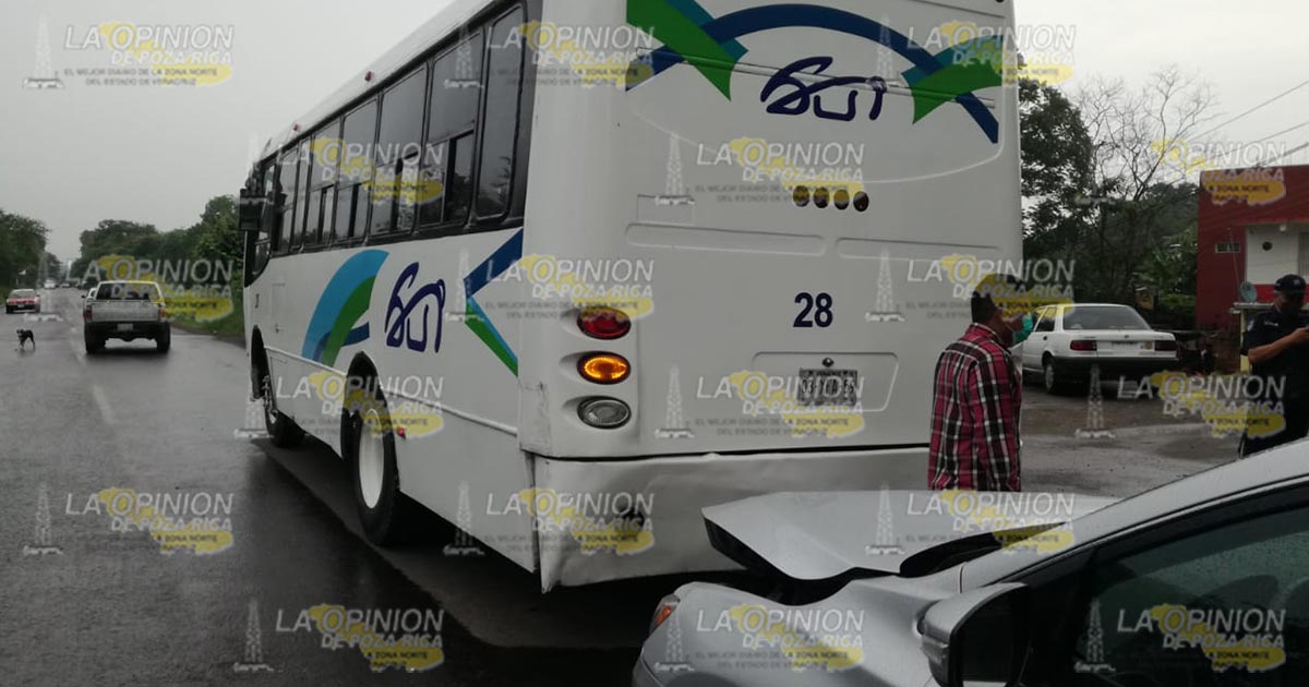 Tuxpan, Ver.- El choque de un automóvil y camión de pasajeros deja como saldo cuantiosos daños materiales; autoridades de vialidad realizaron las diligencias correspondientes y trasladaron los vehículos al corralón de la dependencia donde los involucrados llegaron a un acuerdo.