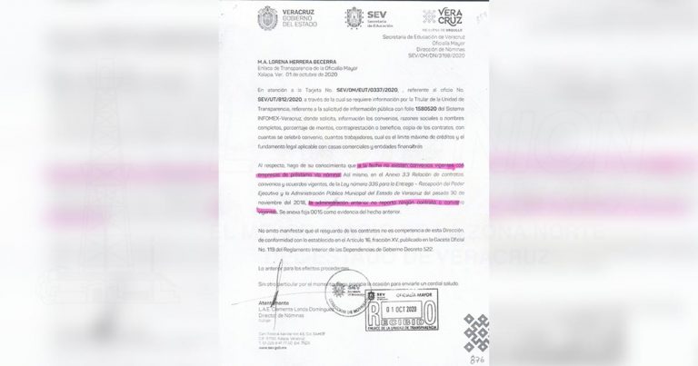 Xalapa, Ver.- La propia Unidad de Transparencia de la Secretaría de Educación de Veracruz (SEV) contradijo las declaraciones del titular de la dependencia Zenyazen Escobar García. Lo anterior, luego de que el funcionario admitió ante los medios que la SEV colabora con cinco sociedades financieras de objeto múltiple con la emisión de préstamos. No obstante, … Sigue leyendo Evidencian falsedades de la SEV de Escobar García