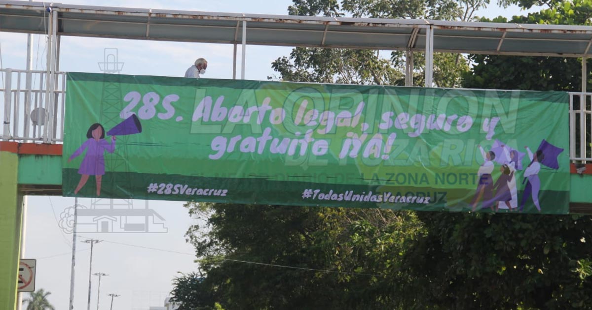 Poza Rica, Ver.- Integrantes del colectivo Marea Verde Totonacapan colocaron una lona sobre el barandal del puente peatonal en el bulevar Adolfo Ruiz Cortines, justo frente a la escuela primaria María Enriqueta, como parte del activismo a favor del aborto legal.