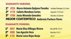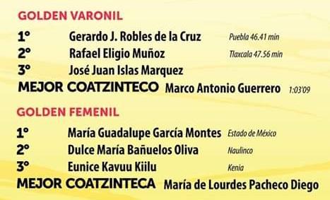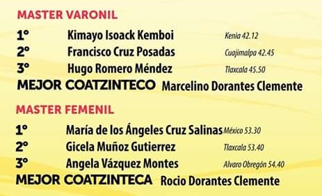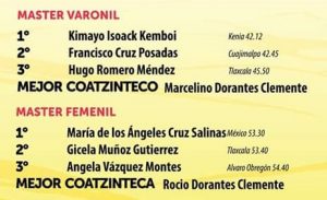 Entre las mujeres, la vencedora fue la colombiana, radicada en México, Palmenia Raquel Agudela Berrio, que marcó en su llegada a la meta 46:18 minutos, dejando el segundo lugar para la tlaxcalteca Karina Pérez Delgado que cronometró 49:55 minutos, mientras que en la tercera plaza general y de la categoría libre, arribó la papanteca, radicada en Xalapa, Ada Iris Pérez Bandala, cuyo esposo Saby Luna Aburto, es uno de los mexicanos que representará a México en los Juegos Panamericanos de Lima, Perú, irá en los 10 mil metros planos.