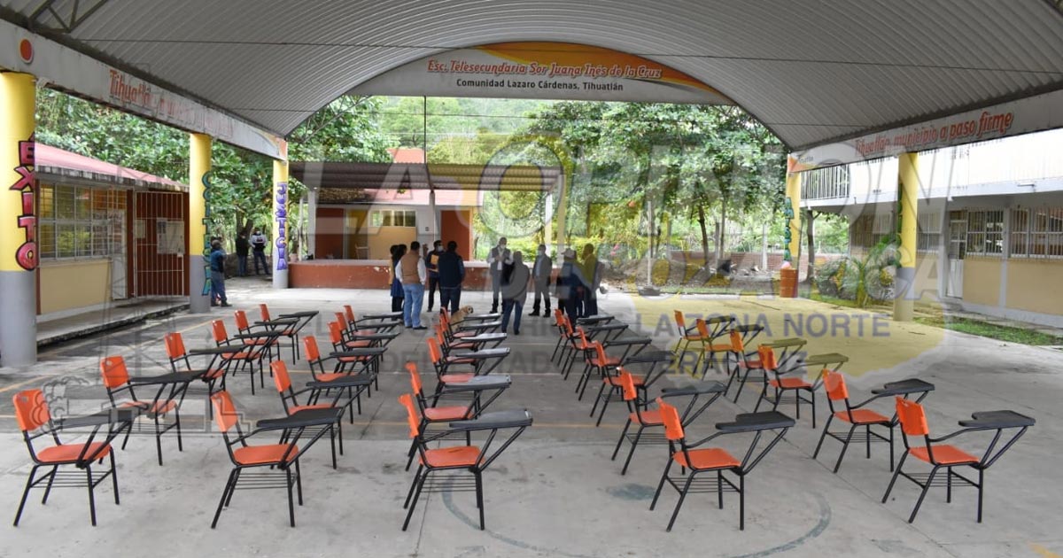 Una de las escuelas beneficiadas fue la telesecundaria “Sor Juana Inés de la Cruz” de la localidad Lázaro Cárdenas del Río, mejor conocida como Kilómetro 6, donde el presidente municipal entregó pupitres para que cuando los alumnos retornen a sus aulas atiendan sus clases con mayor comodidad.