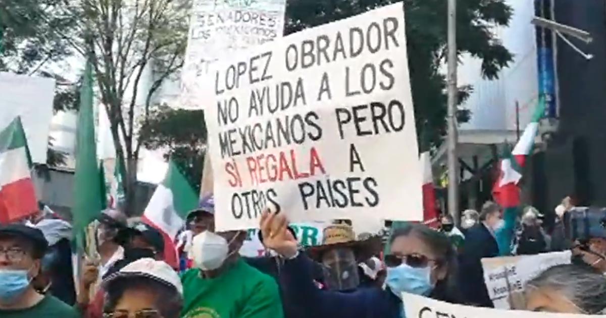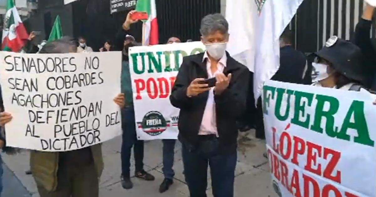 Ciudad de México.- Decenas de integrantes del Frente Nacional Anti-AMLO (FRENAAA) llegaron al Senado de la República para protestar contra la eliminación de los fideicomisos.