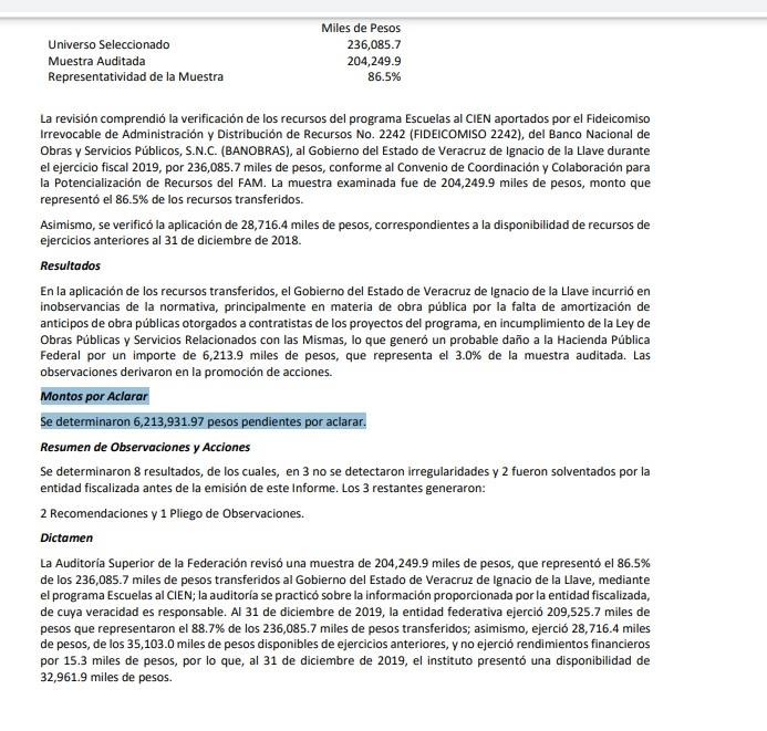 Otro de los rubros bajo la lupa de la Auditoría Superior de la Federación es el correspondiente a Escuelas al Cien, en donde se fiscalizaron 204 millones 249 mil pesos de los 236 millones 085 mil pesos transferidos para la mejora de la infraestructura educativa.