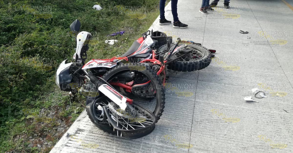 Tuxpan, Ver.- El choque de dos motocicletas deja como saldo cuantiosos daños materiales y dos personas lesionadas; Policías Municipales y personal de Tránsito tomaron conocimiento y destacaron que debido a que una de las unidades fue retirada del lugar los participantes tendrán que resolver el conflicto de reparación de daños ante las autoridades ministeriales.