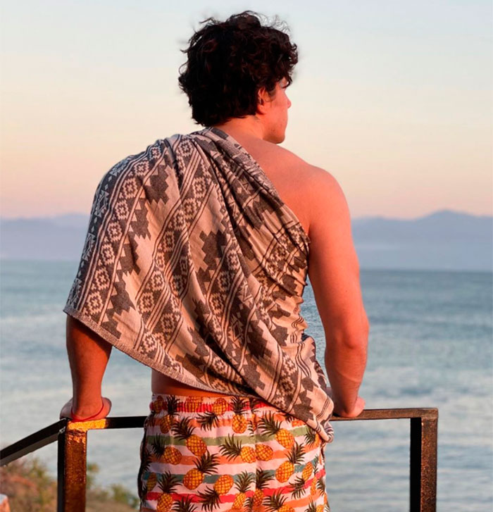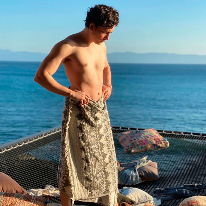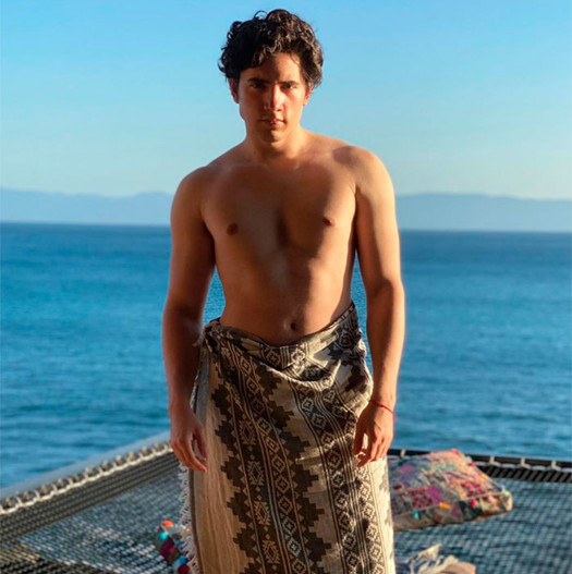 Aunque al principio de las fotos, Alex cubrió su torso con este pareo, mientras más confiado se fue sintiendo fue despojándose de esta prenda hasta que mostró su abdomen, que dio mucho de qué hablar, pues sus fans aplaudieron su condición física.