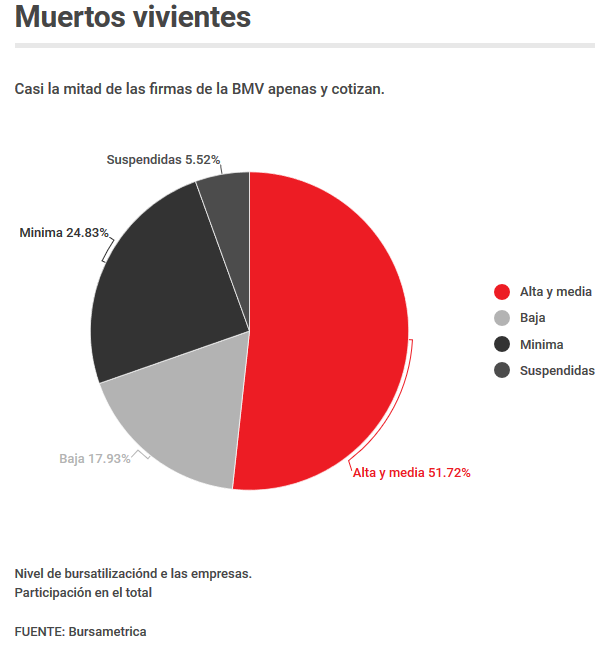 De las 145 emisoras inscritas en la BMV, casi la mitad tienen mínima o baja bursatilización, es decir que la compra y venta de sus acciones es casi nula. Además, existen ocho firmas que están suspendidas por no cumplir con los requisitos mínimos de la BMV: no contar con un mínimo de 100 inversionistas, no mantener colocado por lo menos el 12% de su capital, o no dar a conocer sus resultados financieros de cada trimestre antes de 20 días hábiles después de concluido el periodo.