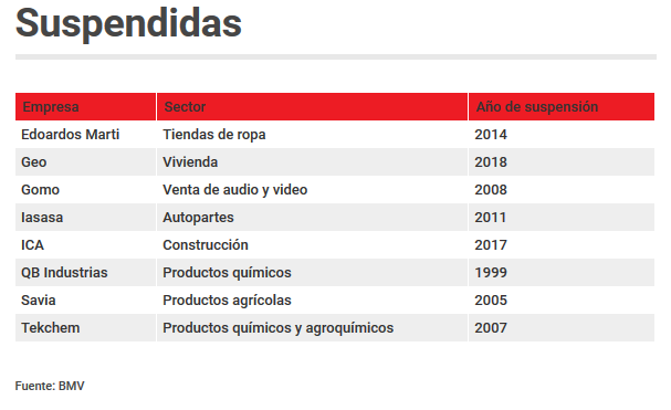 Existen otras empresas que tienen años suspendidas, entre ellas: la importadora y comercializadora de equipos de audio y video Grupo Comercial Gomo, desde 2008; Iasa, industria automotriz IASA, desde 2011, o Edoardos, desde 2014. Incluso estas empresas no cuentan ni con analistas que les den seguimiento.