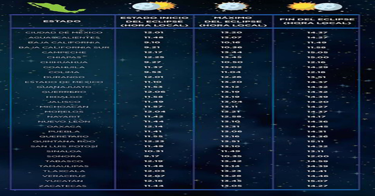 La hora máxima del eclipse será a las 13:20 horas y finalizará a las 14:38 horas, horario del centro, pero la Coordinación Nacional de Protección Civil difunde los horarios, por entidad de la república, en los que podrá apreciarse mejor.