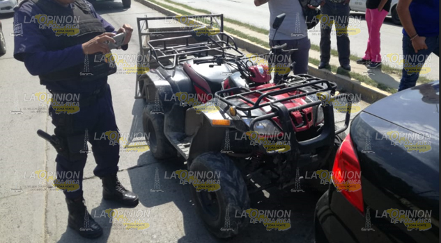 Tuxpan.- Mujer que manejaba una cuatri-moto terminó impactada en la parte posterior de un automóvil provocándole daños materiales en la fascia, autoridades de vialidad y Policía Municipal acudieron para tomar conocimiento.