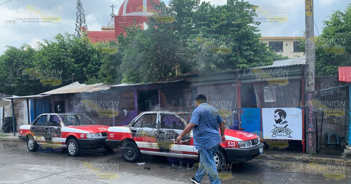 Álamo, Ver. – Una fuerte movilización policíaca se presentó la tarde de este día en la calle Ferrocarril de la zona centro de este municipio justo atrás de la iglesia Nuestra Señora de los Dolores, cuando sujetos armados llegaron hasta el sitio de taxis de la ruta que va de la cabecera hacia Tincontlán y rociaron con gasolina dos unidades, las cuales posteriormente les prendieron fuego.