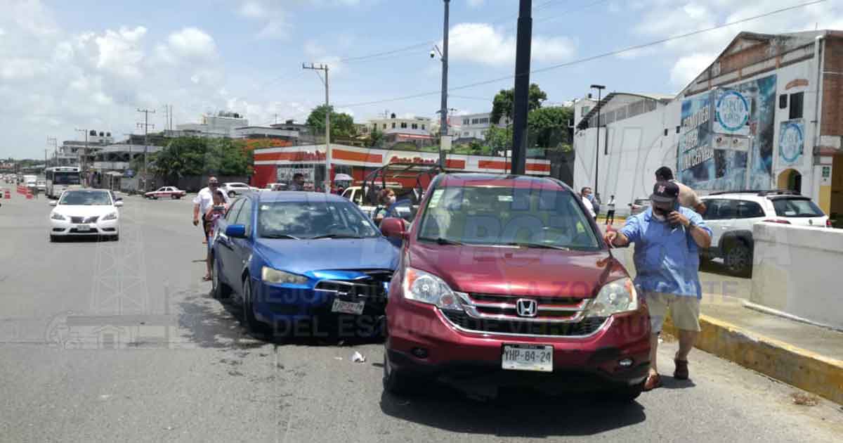 Fue en este sitio donde una camioneta Honda CRV, color rojo, matrícula YHP 8424 del Estado, manejada por Margarita García Tapia, de 65 años, domiciliada en la colonia Enrique Rodríguez Cano, fue impactada por un auto Mitsubichi Lancer, color azul, con placas de circulación YJZ 3978 del Estado, guiado por Norma Alicia Hernández Smith, de 66 años, vecina del infonavit Tenechaco, de esta ciudad.