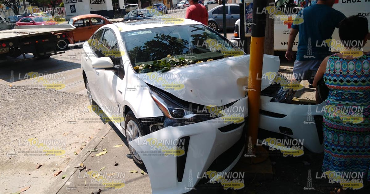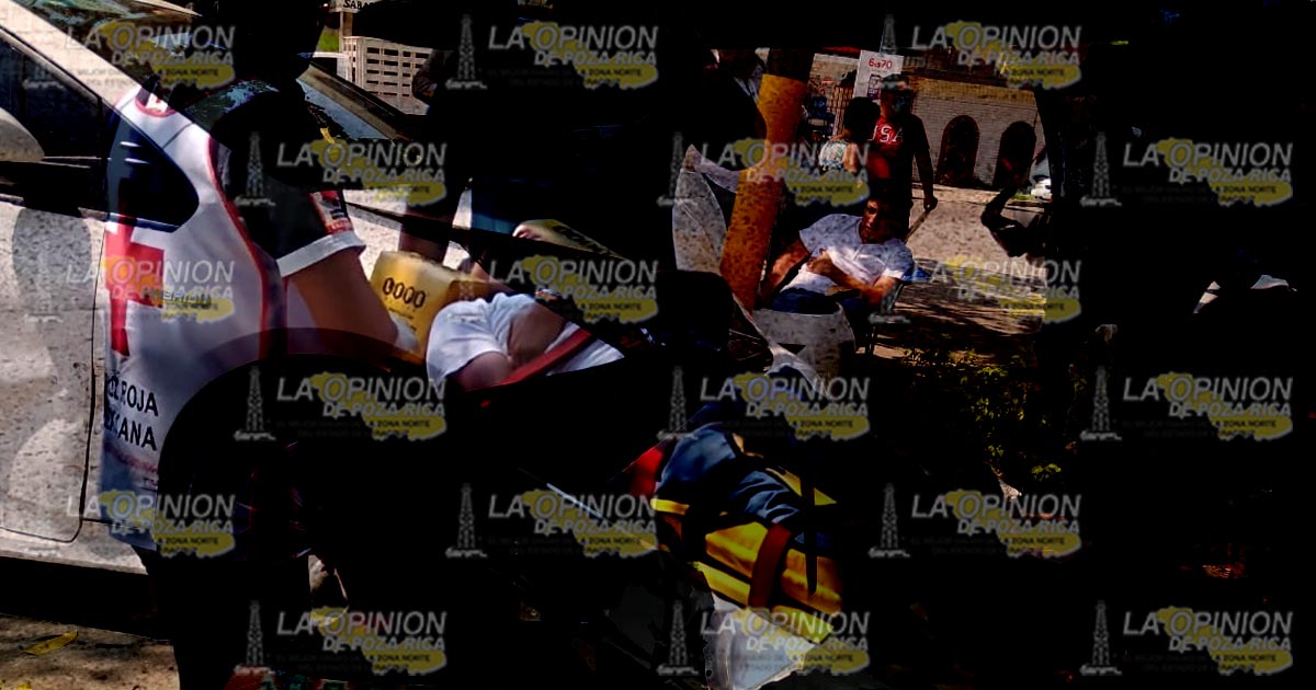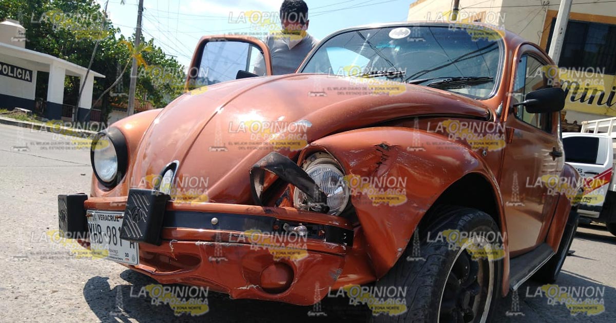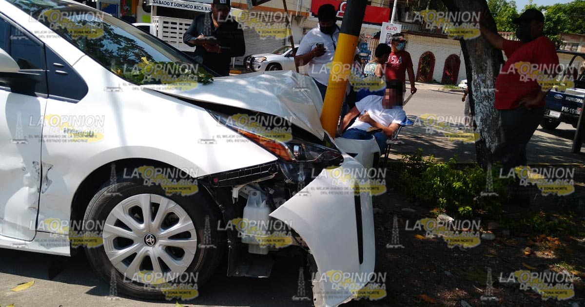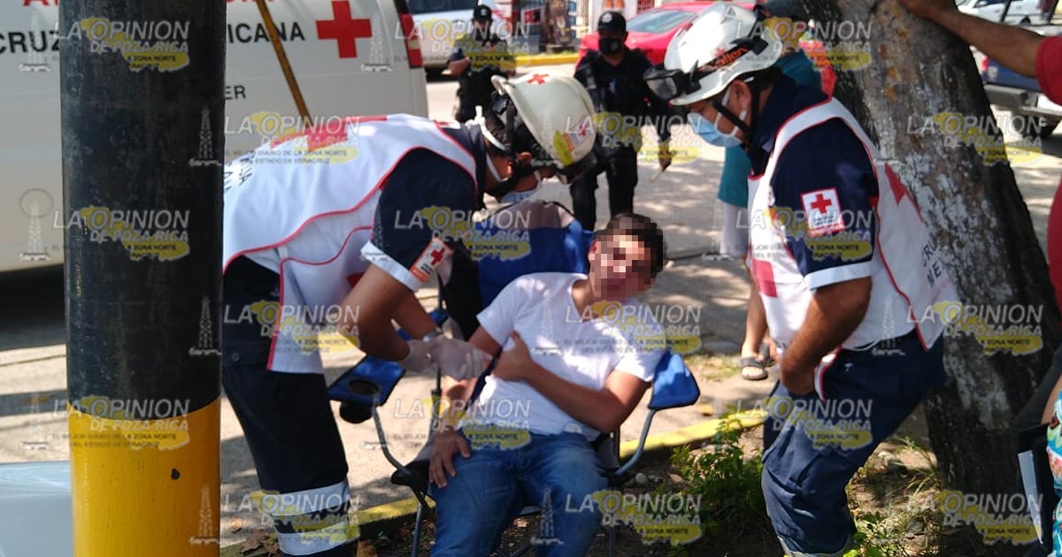 Poza Rica, Ver.- Un joven resultó con probable fractura de pierna, luego de ser impactado por un vehículo compacto de los conocidos «vochitos» que provocó que perdiera el control y finalmente se estrelló contra un poste metálico.