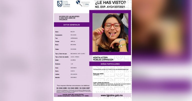 Kentia Atziri Robles Zaragoza, de 26 años, salió de su domicilio ubicado en la alcaldía Cuauhtémoc, el 16 de abril hacia una…