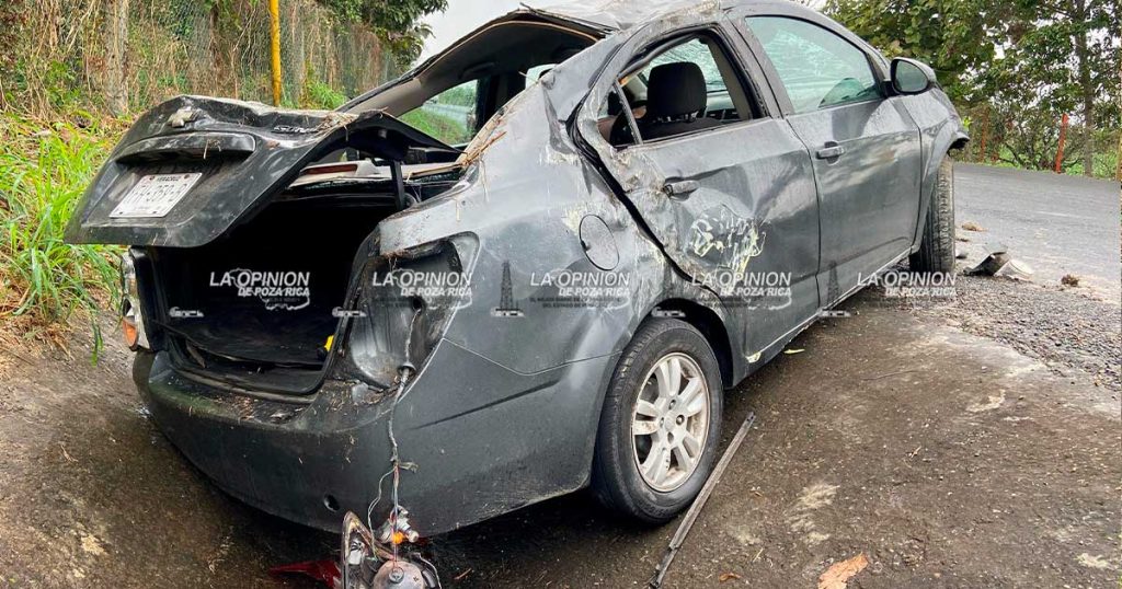 Poza Rica, Ver.– Un fuerte accidente se registró sobre el libramiento Bicentenario, la vía que conecta Poza Rica con Coatzintla, cuando un joven conductor perdió el control de su vehículo Chevrolet Sonic color gris, el cual volcó de manera espectacular, dando varias volteretas antes de quedar destrozado en una cuneta.