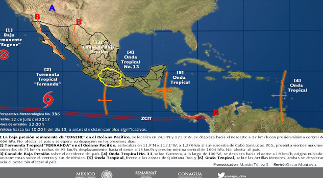 En aviso emitido por el organismo dependiente de la Comisión Nacional del Agua (Conagua) informó que Fernanda se ubica a mil 270 kilómetros al sur-suroeste de Cabo San Lucas, Baja California Sur.