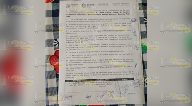 Entre los acuerdos que llegaron fue la reinstalación de los empleados que fueron despedidos injustamente, destitución de manera definitiva de los trabajadores Jesús Cuervo Cobos tesorero municipal, Aquilino Castellanos Valentín Contralor, Mariana Aguilar Contralora, Eduardo Raga Díaz Asesor, que se otorguen plazas para personas propuestas como el comité Pro defensa del Pueblo de Tancoco, un vehículo disponible las 24 horas para cualquier emergencia, el gobierno del estado se compromete a gestionar una visita por parte de la Secretaria de Bienestar para incluir a más ciudadanos a los programas sociales, asignar a una persona responsable para proporcionar el servicio del Agua a los Tancoquenses, contratar mano de obra de este municipio para las acciones que realiza el Ayuntamiento, no se tomaran represalias con quienes participaron en el movimiento entre otras cosas más.