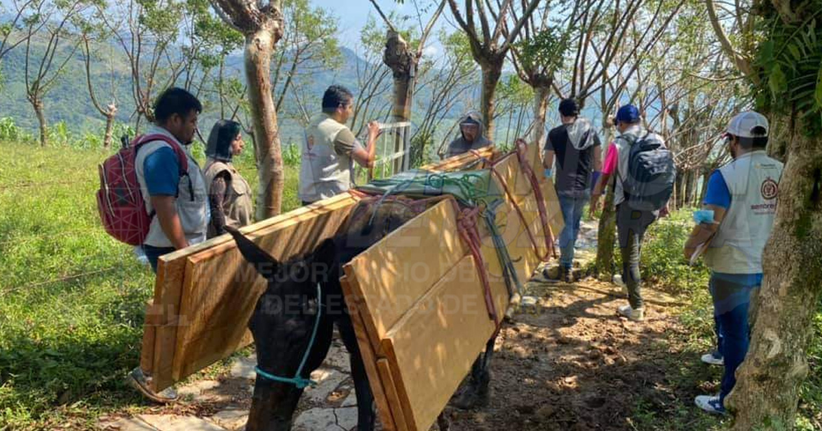 Jóvenes de la Secretaría de Desarrollo Social llegaron caminando (es la única forma de llegar) a la comunidad para recorrer las viviendas y censar a las familias que se quedaron sin techos, así como sin cosechas y que algunas continúan viviendo a la intemperie, debido a que no han podido rehabilitar sus casas.