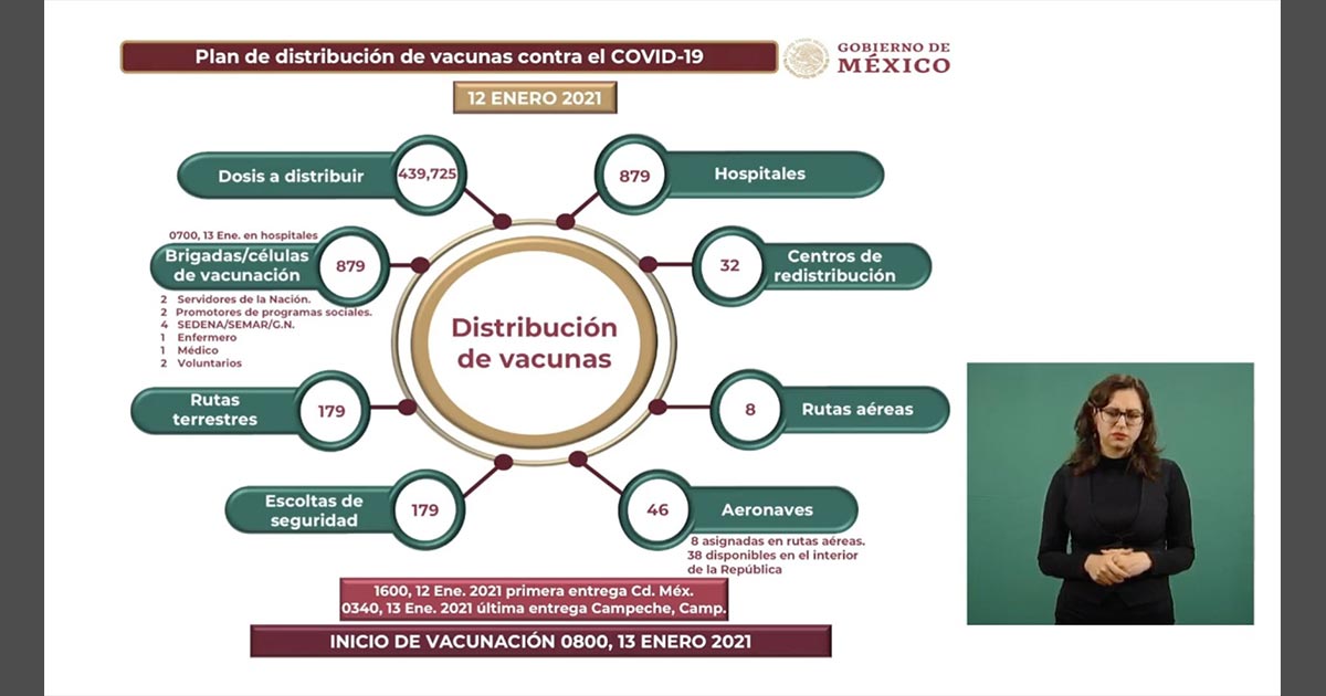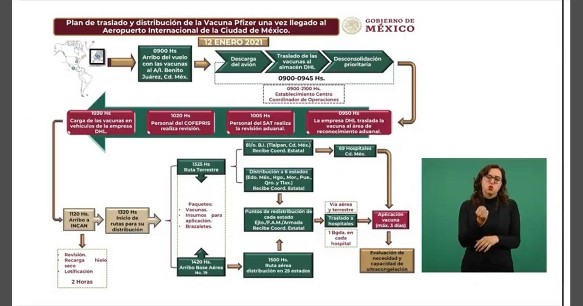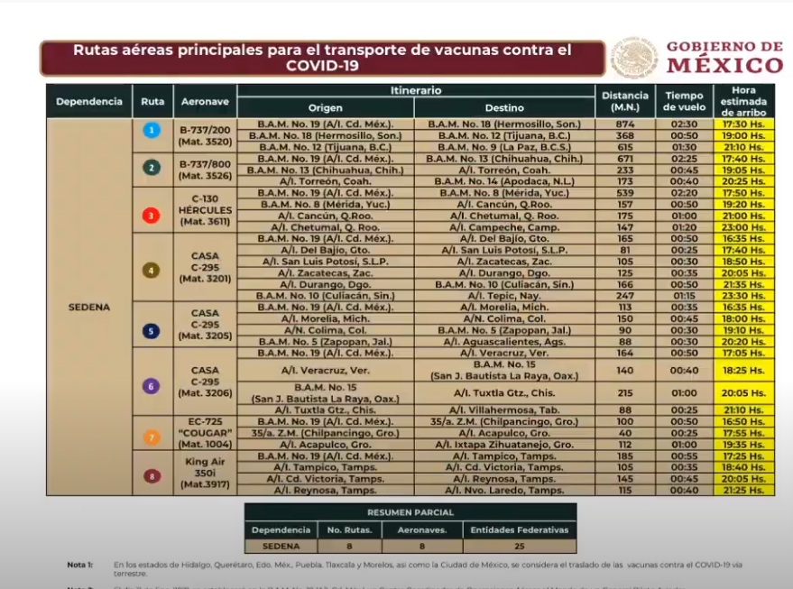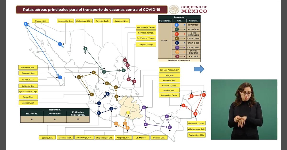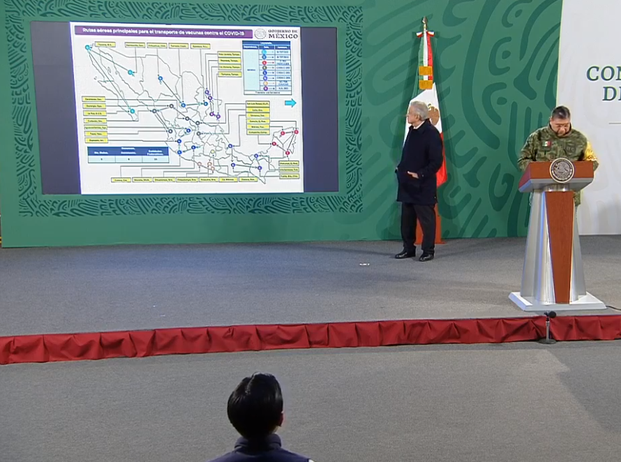En la conferencia matutina presidencial, durante el informe El Pulso de la Salud, el titular de la Sedena Luis Cresencio Sandoval presentó las ocho rutas que se utilizarán para distribuir las más de 400 mil dosis de Pfizer/BioNTech que llegarán este martes.