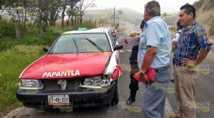 Papantla, Ver.- Daños materiales por varios miles de pesos provocó el conductor de un vehículo de alquiler, luego de que al conducir a exceso de velocidad, terminara impactándose contra una camioneta de lujo, en el libramiento Papantla. Pese a lo aparatoso del percance, no hubo personas que resultaran lesionadas.