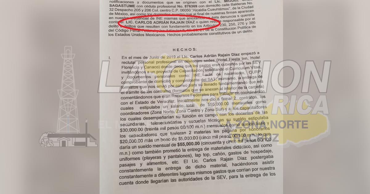Tuxpan, Ver. – Un grupo de trabajadores, entre ellos varias maestras de esta ciudad, interpuso denuncia en contra del licenciado Carlos Adrián Rajain Díaz, quien se ostentaba como Director General de Capacitación Docente de la Secretaría de Educación de Veracruz.