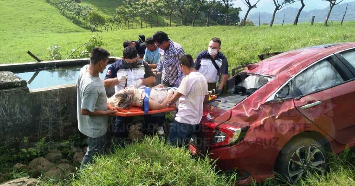 Misantla, Ver.- Cuantiosas pérdidas materiales y una mujer lesionada es el saldo que arrojo aparatoso accidente, cuando la femenina al parecer perdió el control del volante y se fue a meter 35 metros de un potrero, que dando el auto compacto muy averiado.