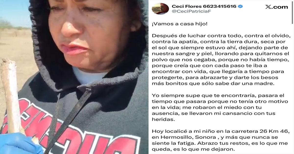 Hermosillo, Son.— La madre buscadora Ceci Flores informó que logró localizar los restos de su hijo en el kilómetro 46 de la carretera 26, en esta ciudad, luego de años de intensa búsqueda.
