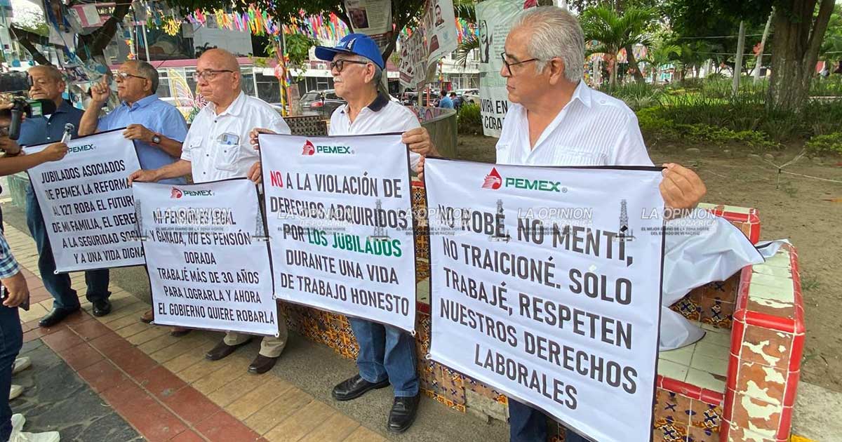 Poza Rica, Ver.- Trabajadores jubilados de Petróleos Mexicanos (PEMEX) se manifestaron en el parque Juárez, en un movimiento simultáneo a nivel nacional, en protesta por la reforma al artículo 127, la cual aseguran les redujo el monto de sus pensiones hasta en un 30 por ciento y el 50 por ciento del aguinaldo.