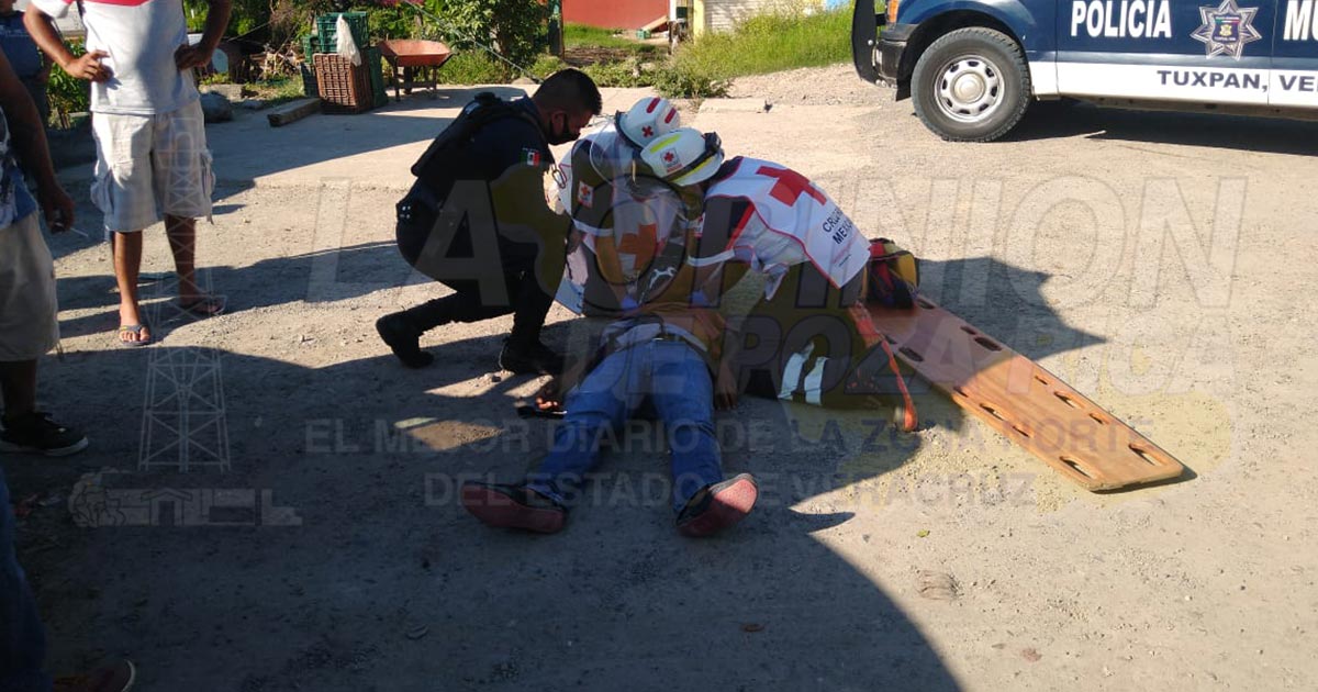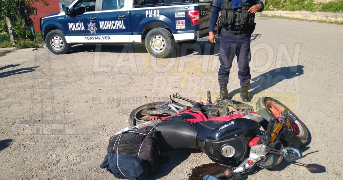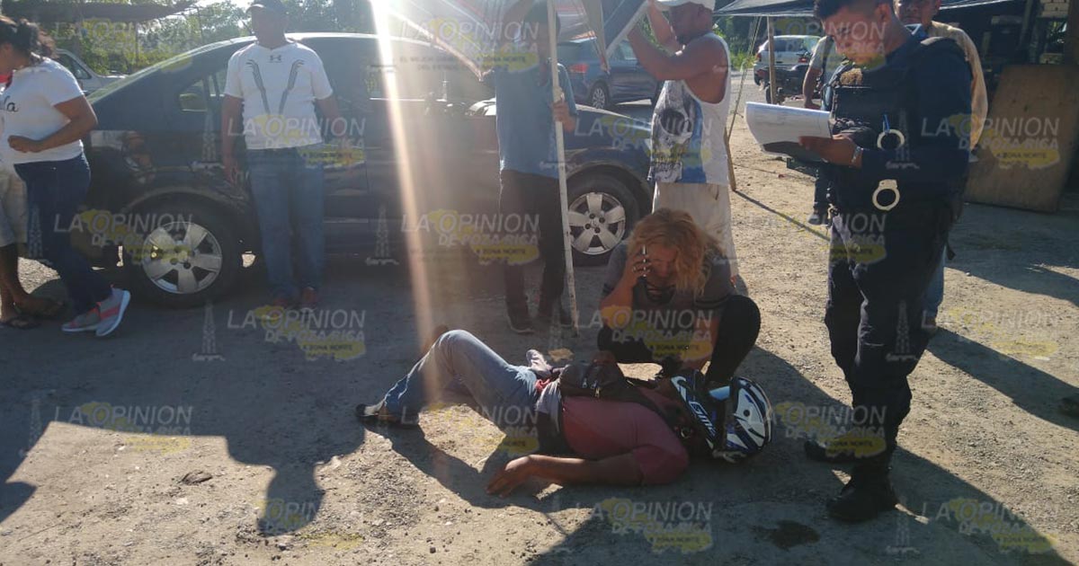 Tuxpan, Ver.- Motociclista que habría derrapado y chocado con el neumático delantero de un coche terminó con diversas contusiones en el cuerpo; paramédicos de la Cruz Roja Mexicana lo atendieron y trasladaron al Sanatorio Naval para su atención médica.