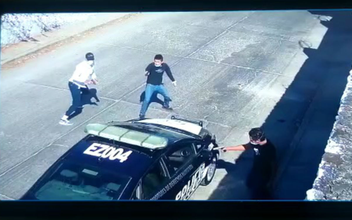 A través de redes sociales circula un video en el que se observa a tres individuos que se acercan a la patrulla EZ004, sacan las pistolas que portan a la altura de la cintura y abren fuego.