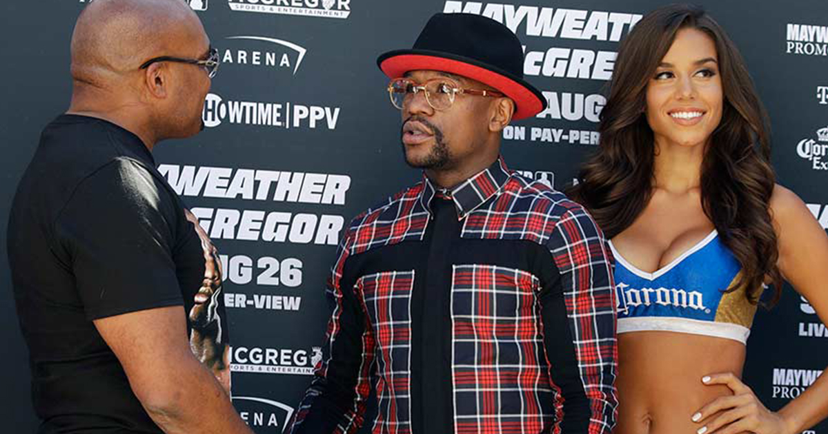 La Toshiba Plaza, afuera de la arena donde se enfrentarán el 26 de agosto,fue el escenario que recibió a uno de los mejores pugilistas de la historia y a la estrella de las artes marciales mixtas.
