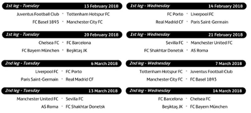 Los juegos de ida de los octavos de final se disputarán el 13-14 y 20-21 de frebrero, mientras que la vuelta será el 6-7 y 13-14 de marzo.