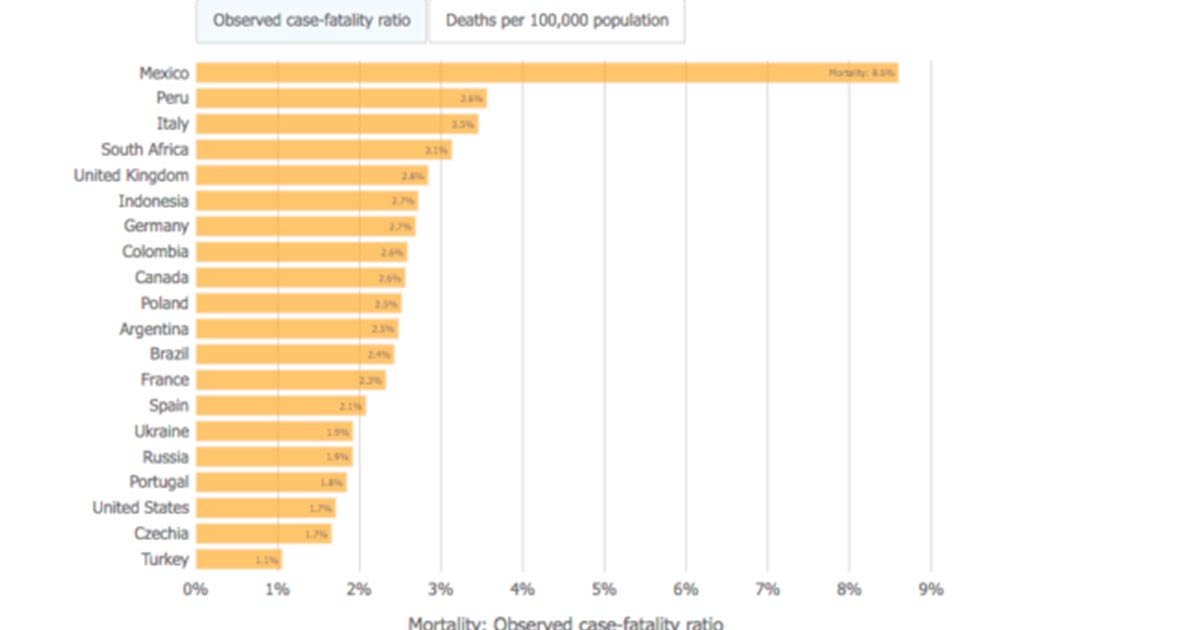 Y es que el porcentaje de muertes por cada 100 mil habitantes es de 8.6; mientras que el de Perú es de 3.6; Italia, 3.5; Sudáfrica, 3.0; Inglaterra, 2.8; Indonesia, 2.7; y Colombia y Canadá con 2.6 por ciento.