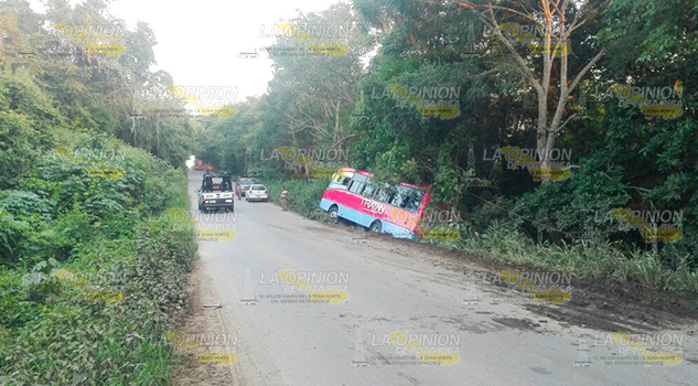 Tantoyuca, Ver.- Microbus de la empresa TRATAN que brinda el servicio de transporte público local, estuvo a punto de sufrir una volcadura durante la tarde del martes sobre la carretera estatal, Tantoyuca-Platón Sánchez, cerca de la localidad El Remanso perteneciente a este municipio.
